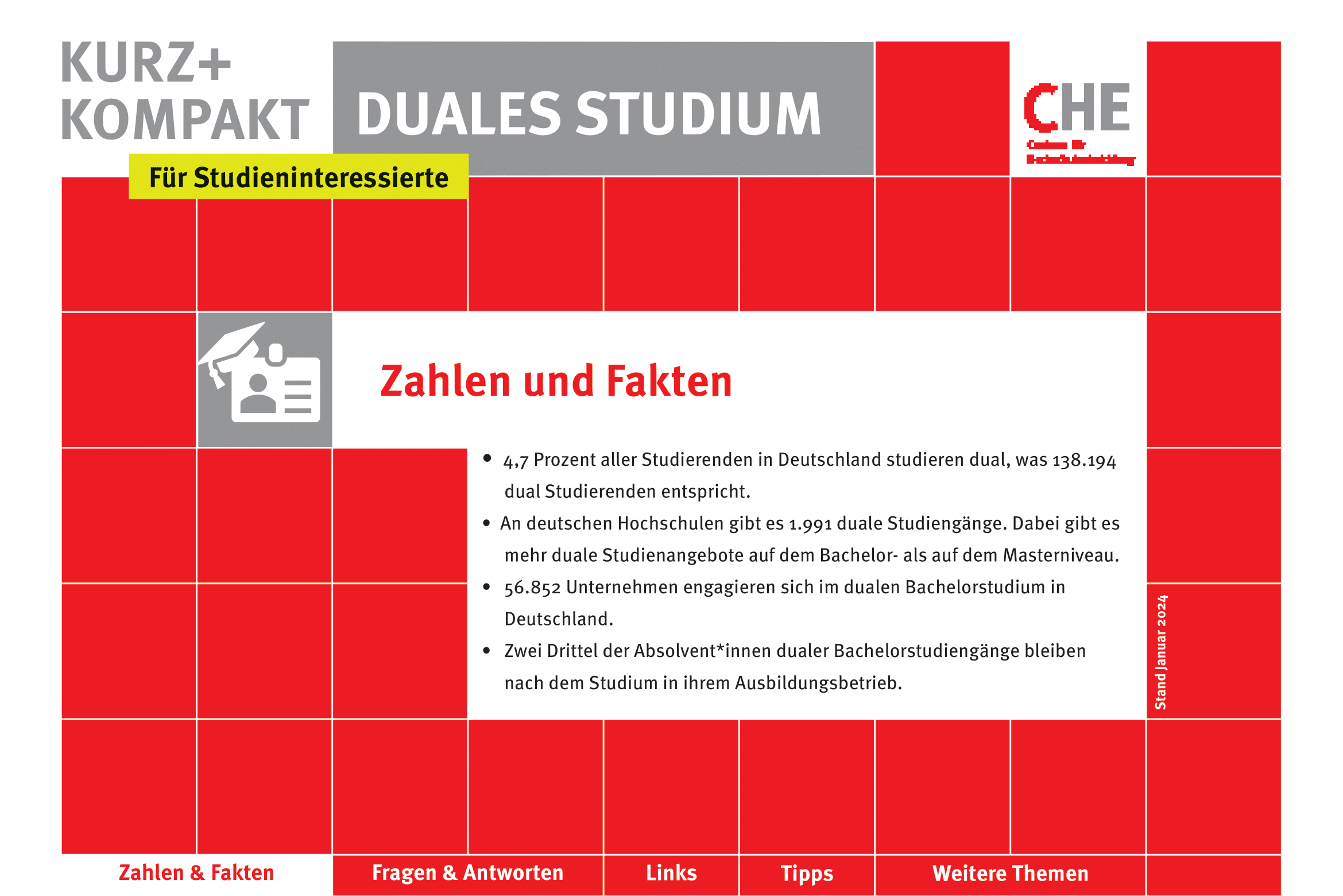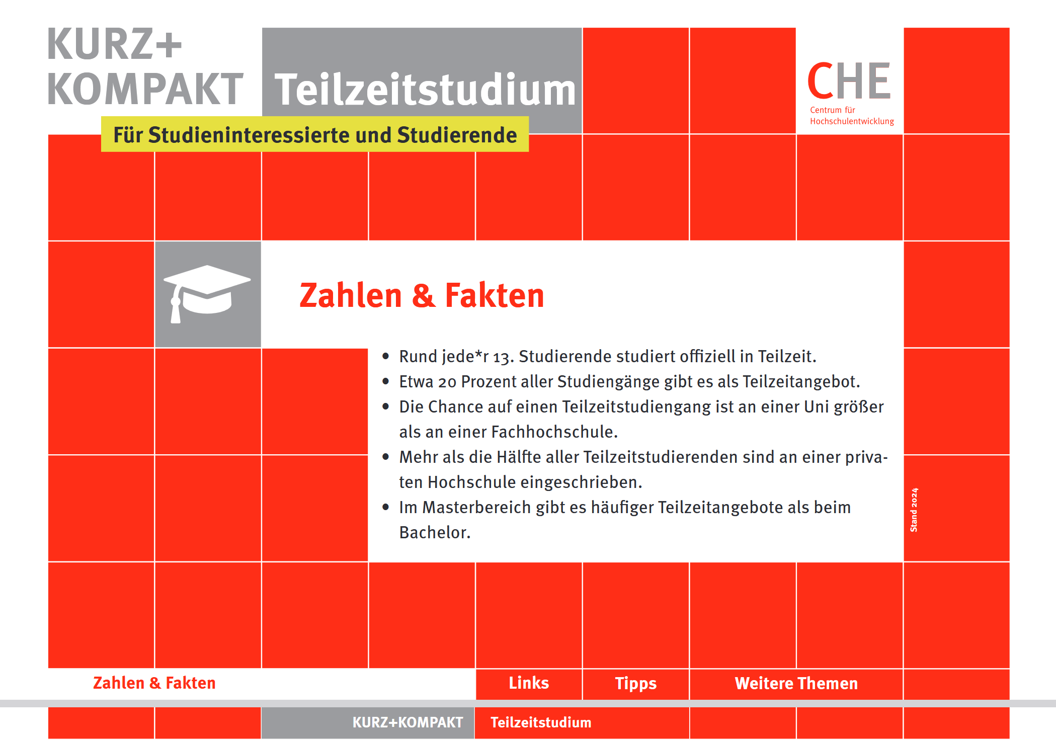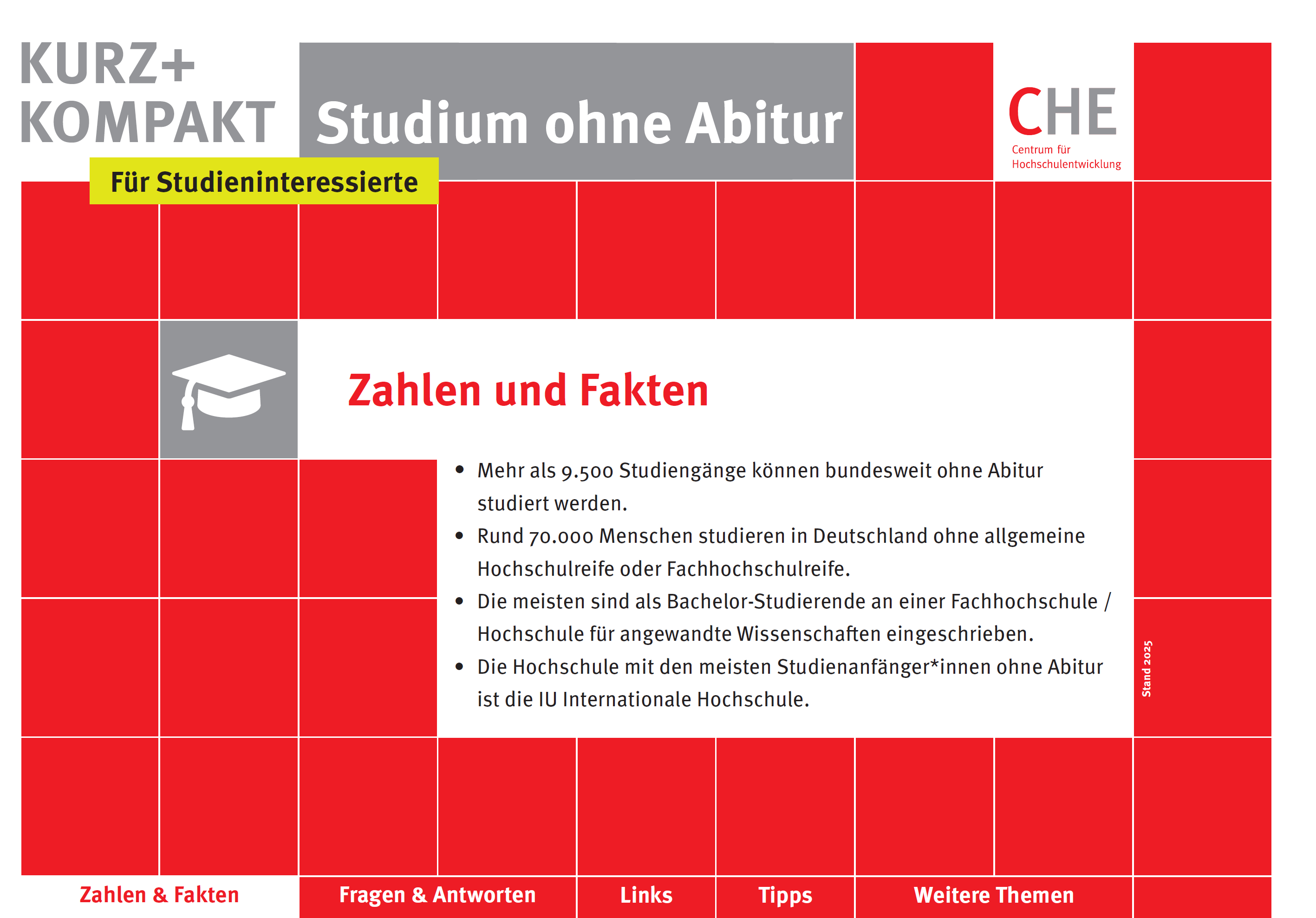 Die Reihe CHE kurz + kompakt bietet kompakte Informationen zu ausgewählten Themen. Auf wenigen Seiten finden sich Antworten auf die wichtigsten Fragen zum jeweiligen Thema und eine kommentierte Linkliste. Checklisten für nächste Schritte und weitere Recherchen runden das Infopaket im PDF-Format ab. Sämtliche Publikationen stehen kostenfrei als Download zur Verfügung.