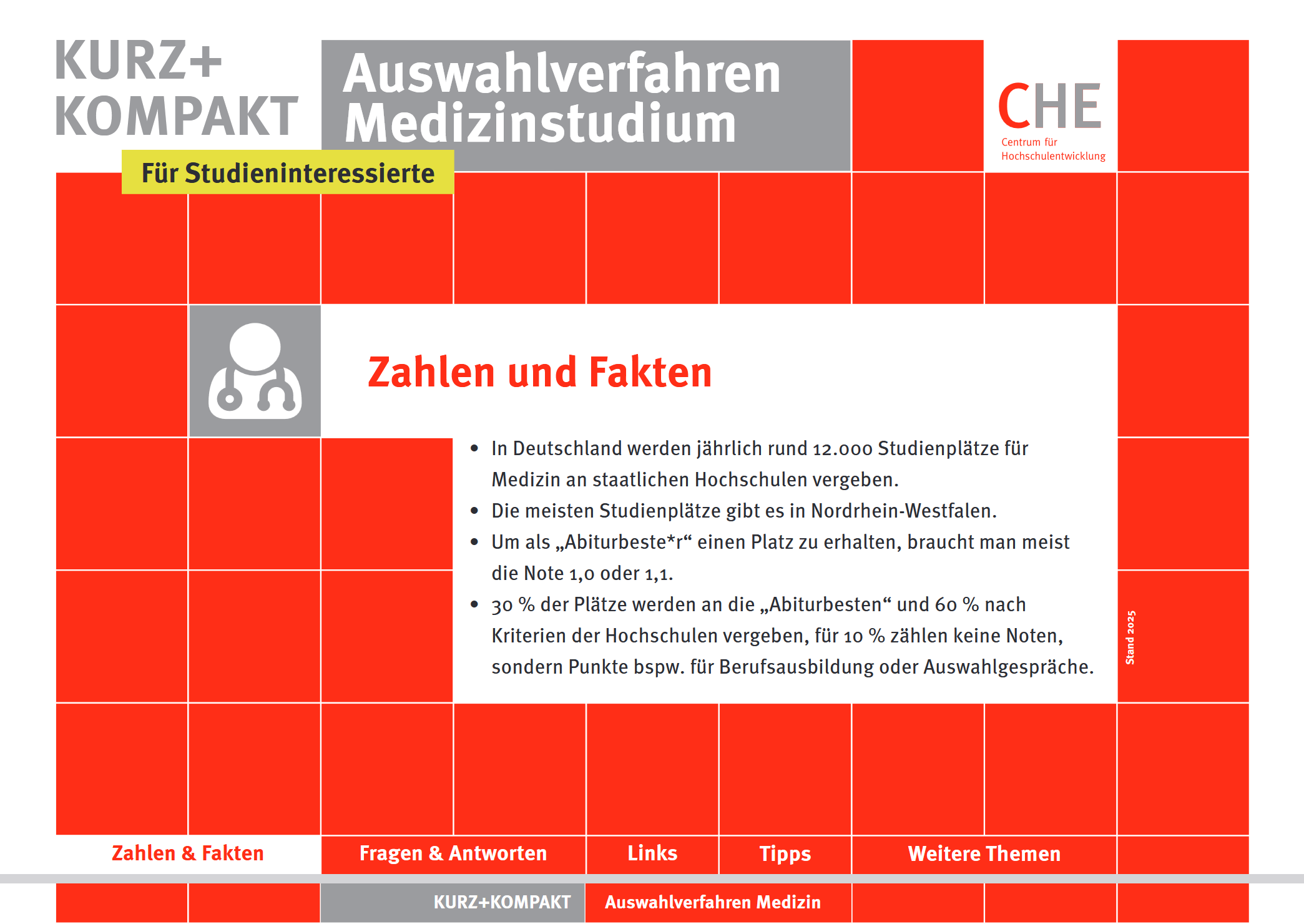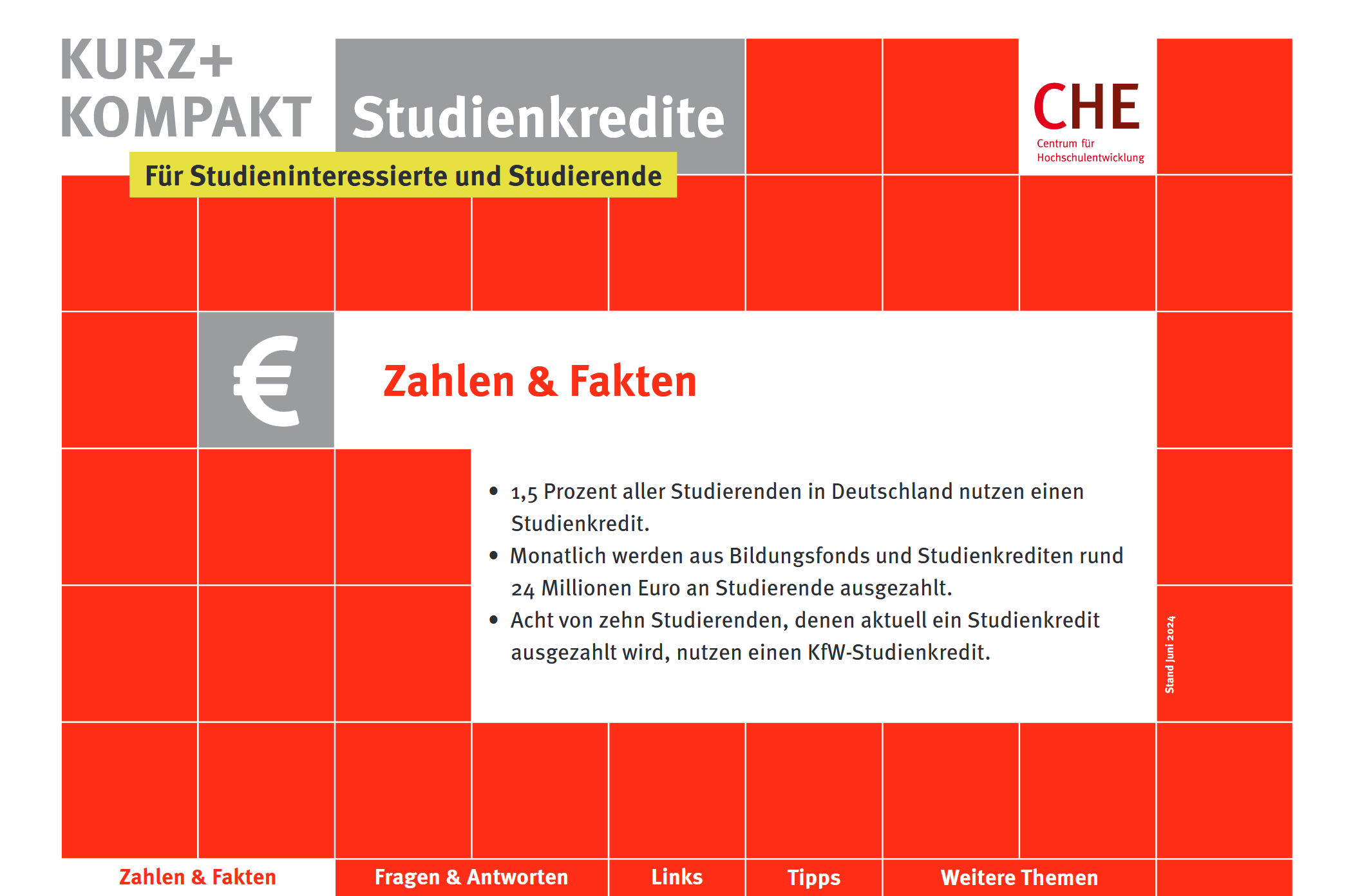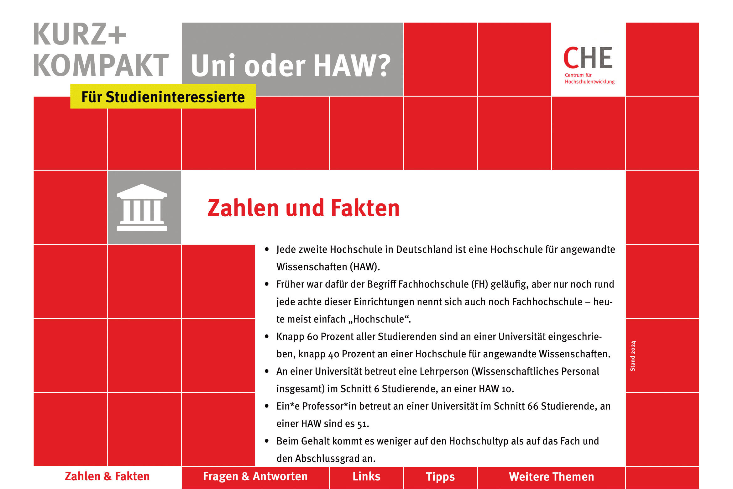 Die Reihe CHE kurz + kompakt bietet kompakte Informationen zu ausgewählten Themen. Auf wenigen Seiten finden sich Antworten auf die wichtigsten Fragen zum jeweiligen Thema und eine kommentierte Linkliste. Checklisten für nächste Schritte und weitere Recherchen runden das Infopaket im PDF-Format ab. Sämtliche Publikationen stehen kostenfrei als Download zur Verfügung.